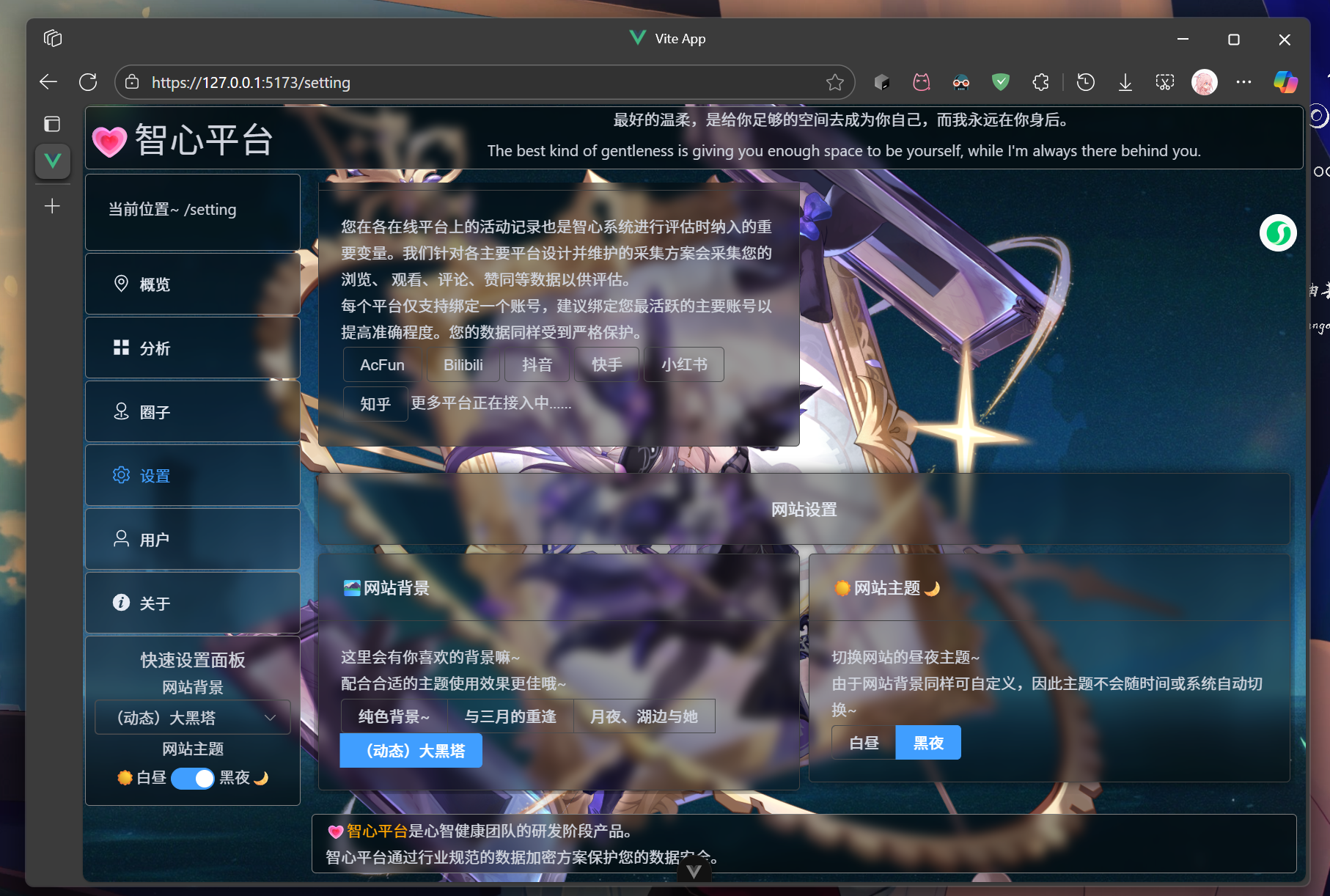 Vue是一个Javascript框架,它对开发网站前端本身没有任何限制,因此可以轻松地做更多有意思的事情,比如,用一个iframe作为网站的动态背景,装一个Wallpaper Engine的网页动态壁纸进去~
