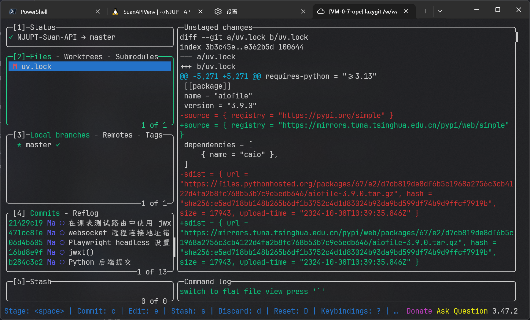 进入到一个 git 仓库所在目录后,使用 lazygit 进入 TUI。
