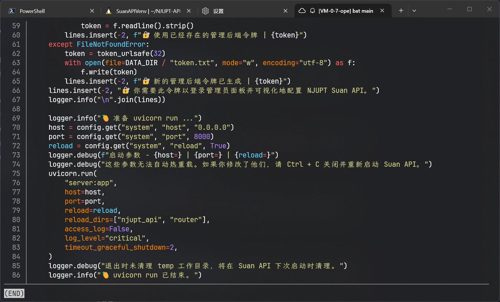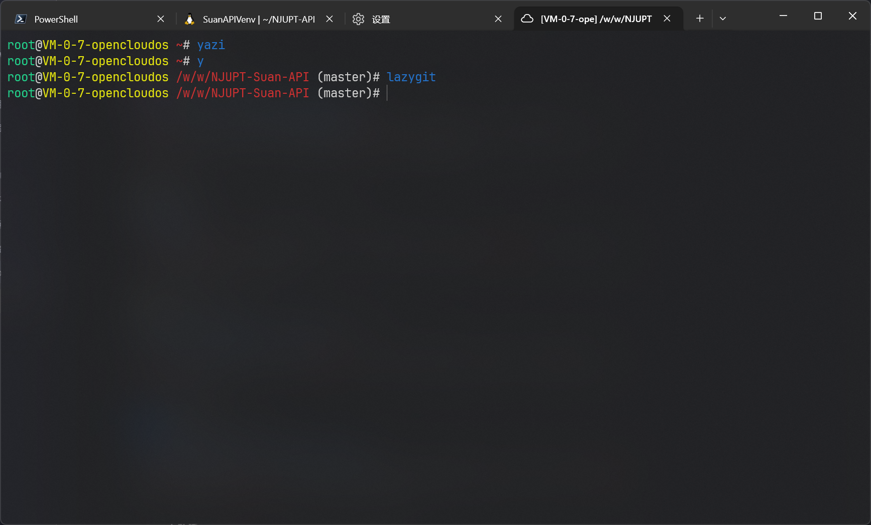 对于芒果正在折腾的 NJUPT Suan API 来说,就是两个小的面板分别运行 uv run main.py 和 pnpm run dev,然后右边的大面板视情况开 lazygit 或者 yazi。其他的标签页用来手动运行 JetBrains Remote dev 的 IDE 后端,只需要一个 PyCharm 就完全可以胜任前后端的开发工作,手动运行后端的主要好处是可以跳过 JetBrains Gateway 的漫长的启动过程,目前暂不清楚会有什么坏处。